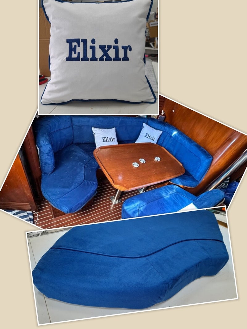 Voor een luxe zeiljacht een prachtige ronde zithoek voorzien van nieuwe kussens. Het diepblauwe suède heeft al een prachtige uitstraling, het biesje in de vorm maakt het helemaal af.